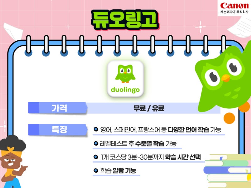 듀링고는 무료로 다양한 언어를 학습할 수 있는 플랫폼입니다.사용자는 자신의 학습 스타일에 맞춰 3분에서 30분까지의 짧은 레슨을 선택할 수 있으며, 테스트를 통해 개인 맞춤형 학습이 가능합니다.